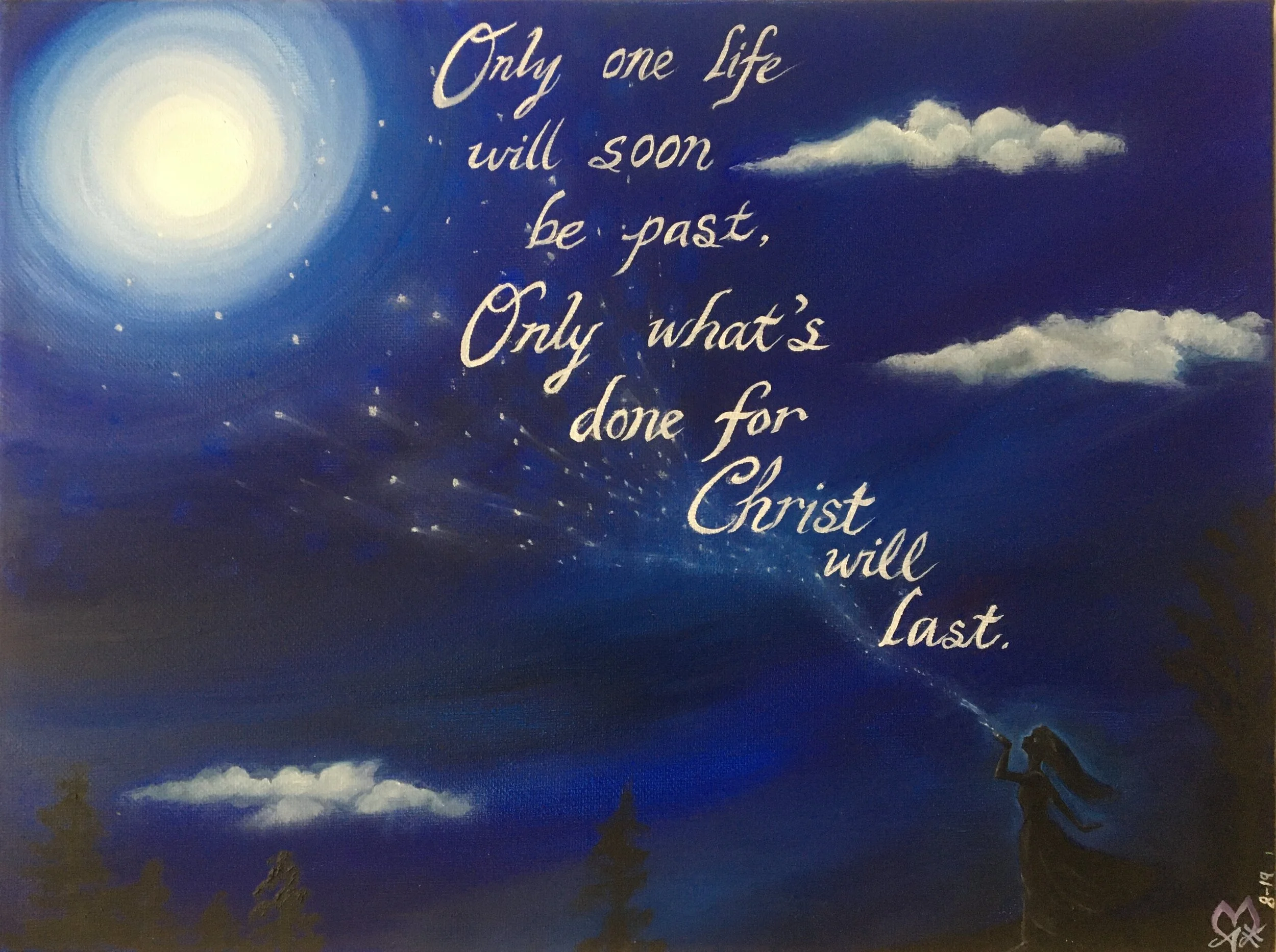 One Life I don’t know who said this quote, but this painting was inspired by it. Our lives are so fleeting - a vapor (James 4:14), and we have a limited time to do things that matter for eternity.