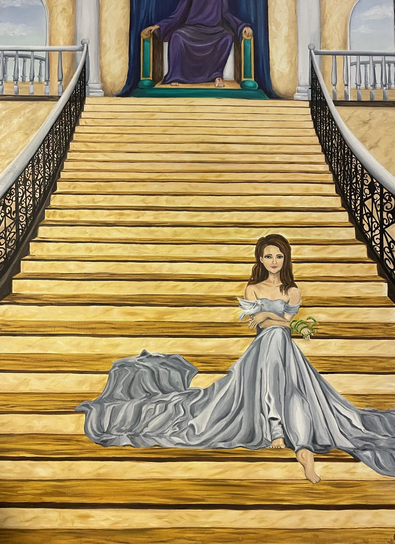 Throne Room This is inspired by the verse, Matthew 10:16. This is how I would picture the throne room of a heart - clean, and prepared for the King. Jesus is represented in purple, the color of royalty, and seated on the throne. The woman is clothed in silver, the color of redemption. She isn’t meant to represent a specific person, just a daughter of God. Her positioning, with her foot forward, means that she is ready to go out into the world at any moment. As she goes out on missions for the King, she has to be careful and crafty, (represented by the snake), as well as innocent (dove).