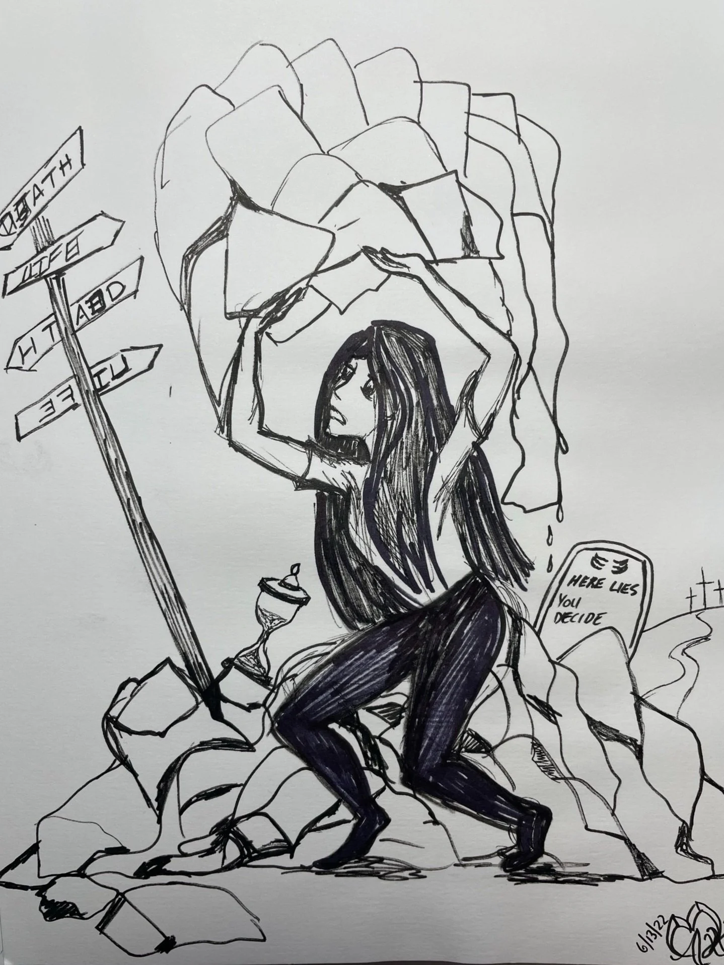 Deciding Life With this illustration, I was attempting to show the emotional weight of having to decide when to stop treating a loved one and allow them to die. I’ve had to do this twice in my life, but with the most recent one, I felt I had to make the decision alone. Ultimately, we don’t really have that kind of power over life and death - only God does. And, for those who are saved, it isn’t the end. Still, those situations can seem so heavy and lonely. The sign represents the choices, which are often unclear and confusing. The hour glass shows the time constraints and pressures added by health care providers and family members. The grave stone is obvious. The crosses in the back shows that there is hope even in the midst of these situations.